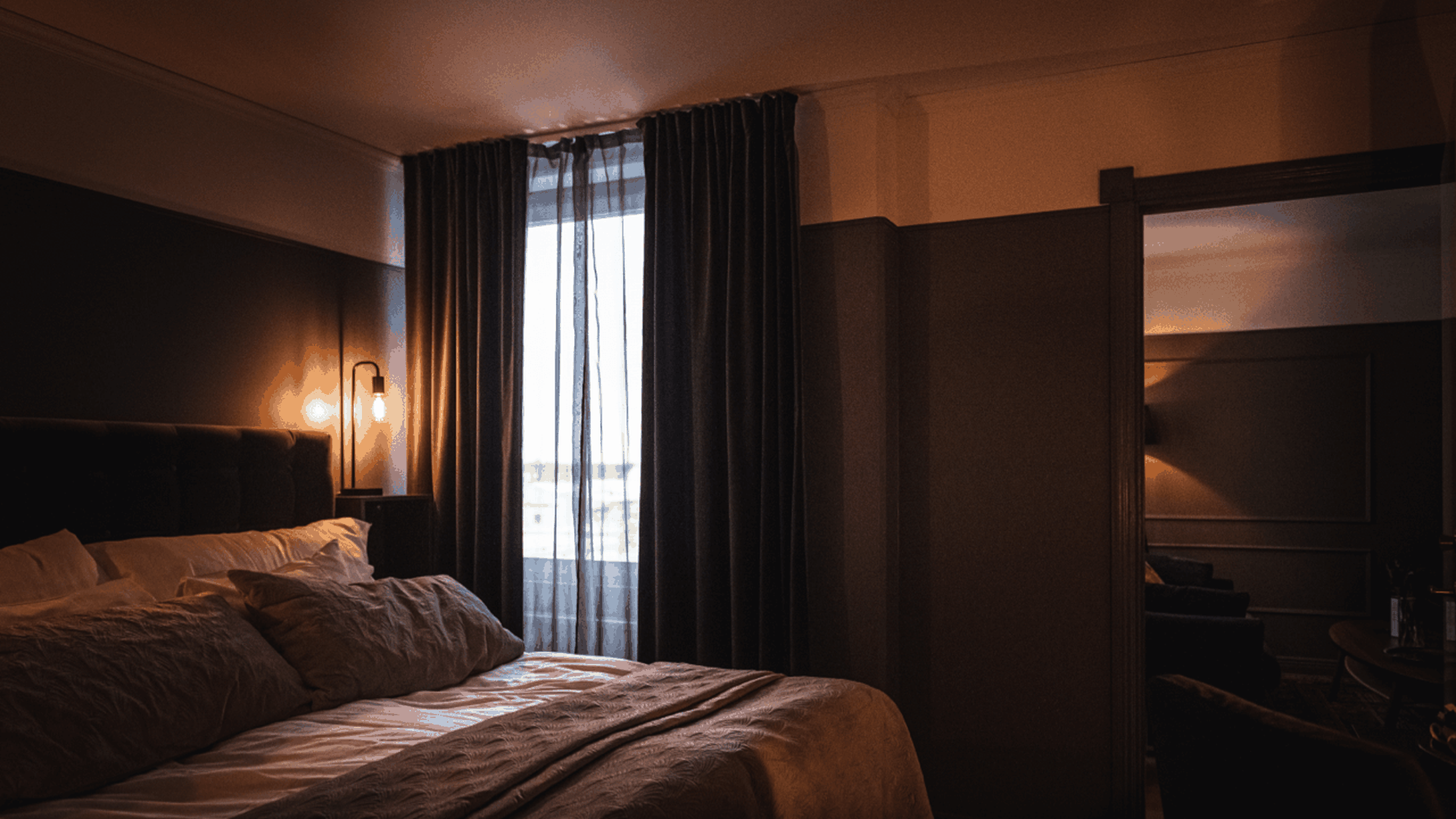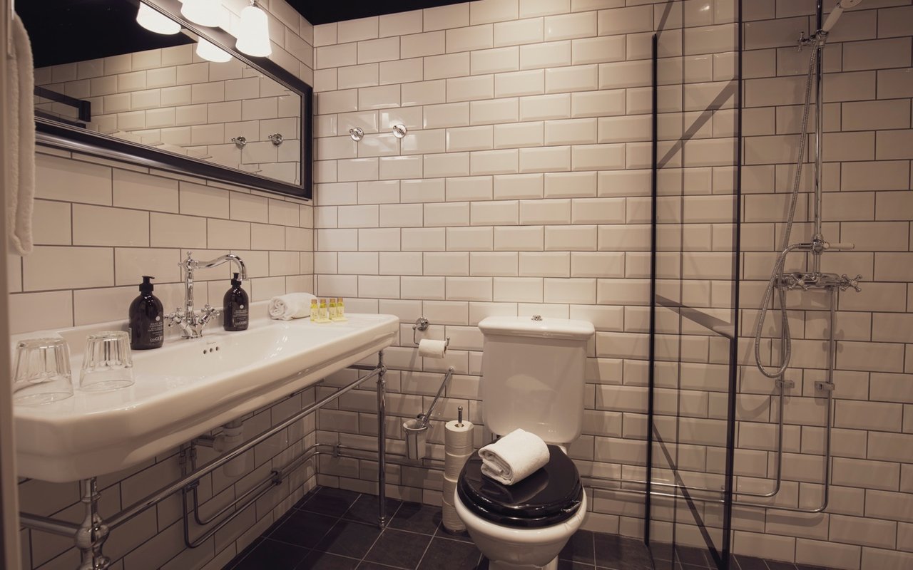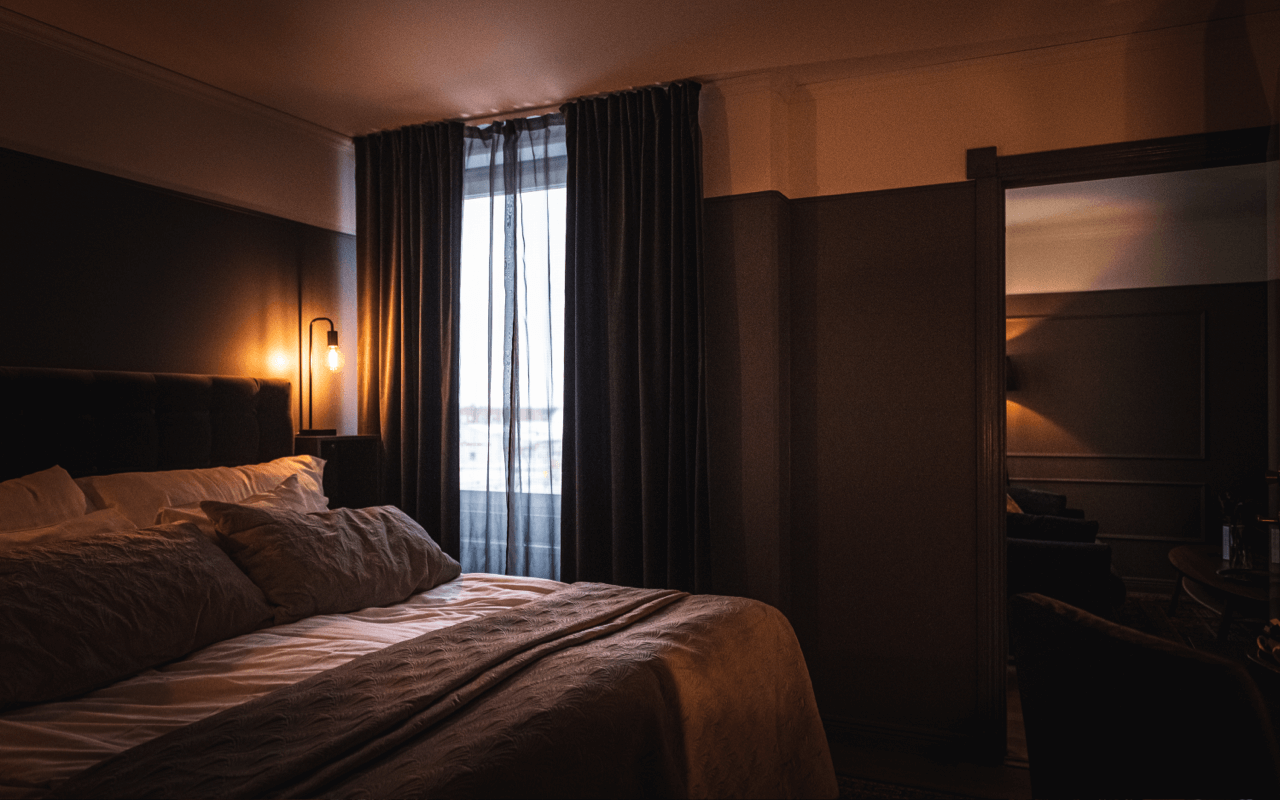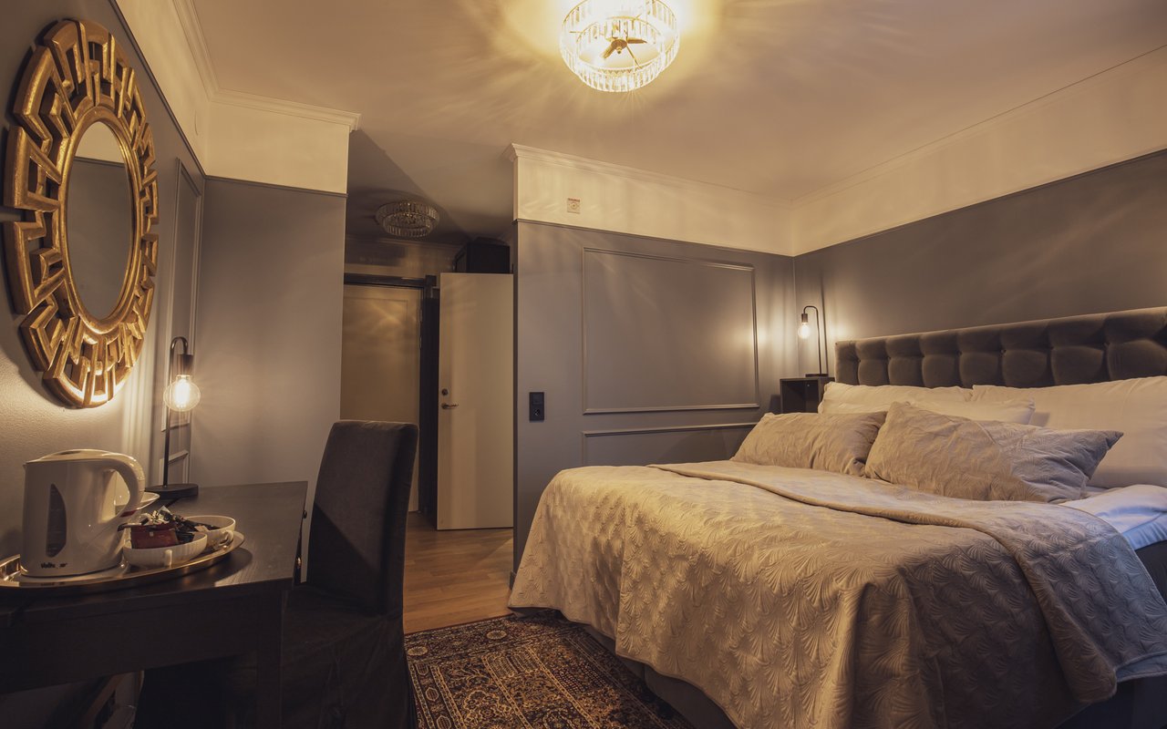 Möt morgonen i vår suite där morgonsolen kikar in och väcker dig varsamt. Vardagsrummet är inrett med en soffgrupp och en stor TV bland annat. Du behöver inte dela badrum, utan det finns två stycken! Ena har dusch och den andra har ett stilfullt badkar. Är ni fler än två, så går det också bra att bo i vår suite, då soffan är bäddbar.